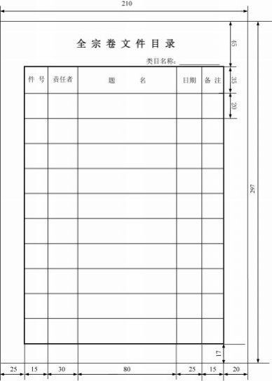 82   全宗卷文件目錄采用 A4(長 ×寬為 297 mm×210 mm) 紙張 、表格形式,設(shè)置“類目名稱”“件號”“責 任者”“題名”“日期”“備注”等項目。目錄式樣見圖 A2。