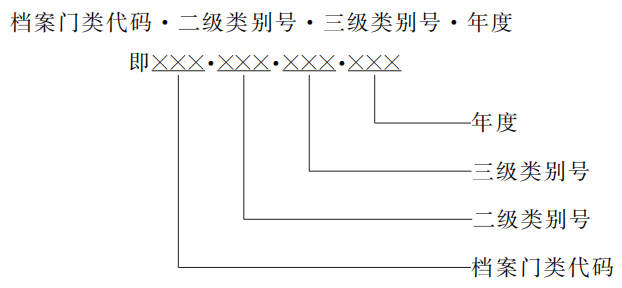 7.1.2 按件整理的檔號結(jié)構(gòu)中,類別號的構(gòu)成元素包括一級類別號(檔案門類代碼)、二級及三級類別號、年度、保管期限代碼、機(jī)構(gòu)/問題代碼。其結(jié)構(gòu)按相關(guān)規(guī)定或根據(jù)實際需要確定。