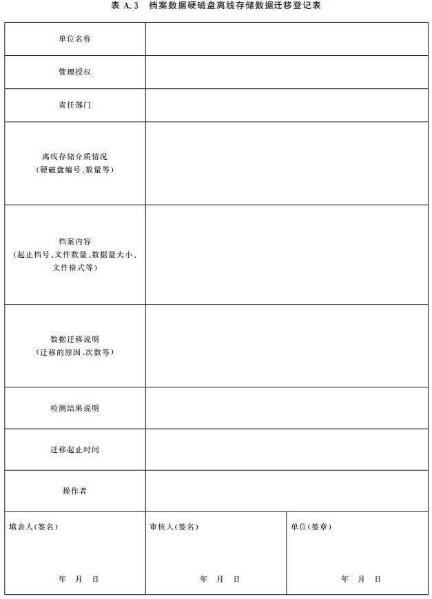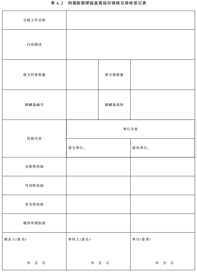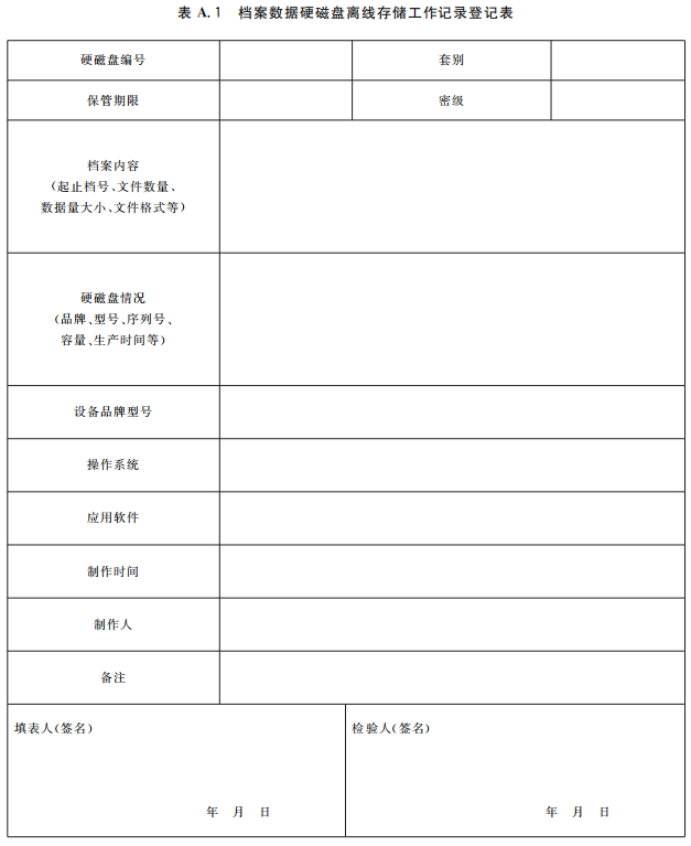 6.5.3 應對檔案數(shù)據(jù)硬磁盤離線存儲的管理活動進行登記,登記內(nèi)容參見GB/T18894-2016表A.2。