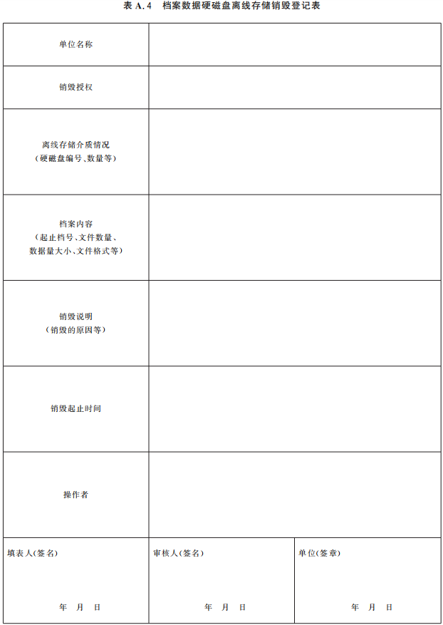 12.3 銷毀時應填寫銷毀登記表并歸檔保存,登記內(nèi)容參見表A.4。