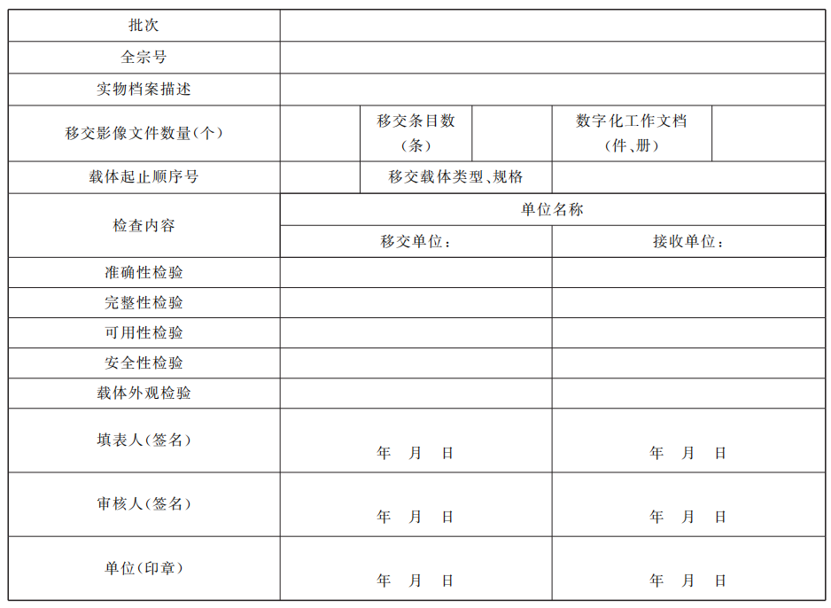 驗(yàn)收合格的數(shù)字化成果應(yīng)按照實(shí)物檔案數(shù)字化工作方案及時(shí)移交,并履行交接手續(xù)。移交單示例參見附錄 B.8。