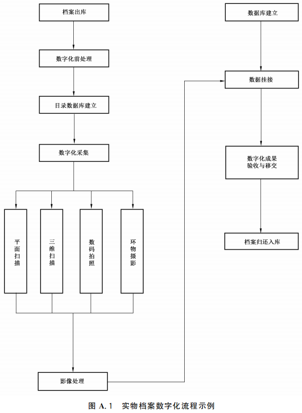 5.5.1 應(yīng)制定相關(guān)的工作流程和各環(huán)節(jié)操作規(guī)范等,對(duì)實(shí)物檔案數(shù)字化全過程進(jìn)行有效的控制,確保數(shù)字化成果質(zhì)量。實(shí)物檔案數(shù)字化流程示例參見附錄A。
