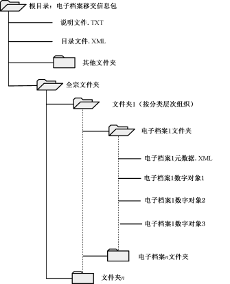 圖 B.1中的全宗文件夾下,按分類層次組織文件夾,電子檔案文件夾以檔號命名,存放電子檔案內容數據及其元數據。