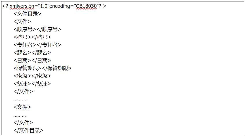 圖B.1中,目錄文件命名為“目錄文件.XML”,存放有關檔案的目錄信息,目錄文件與每份電子檔案相對應,根據電子檔案具體歸檔方式進行描述。以“件”的方式管理為例,目錄文件 XML信息格式見示例2(encoding屬性值可以是“GB18030”、“GB2312”、“UTF-8”)。