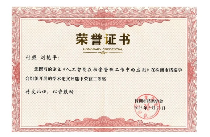 德爾斐科技公司榮獲株洲市檔案學(xué)會2024年度先進單位、付盟總經(jīng)理個人獲優(yōu)秀組長、學(xué)會論文評選二等獎。