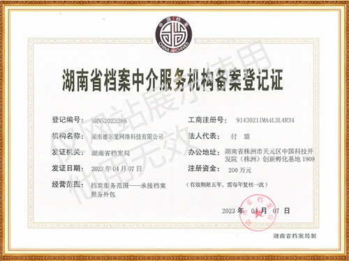 湖南省檔案服務機構備案登記證書
